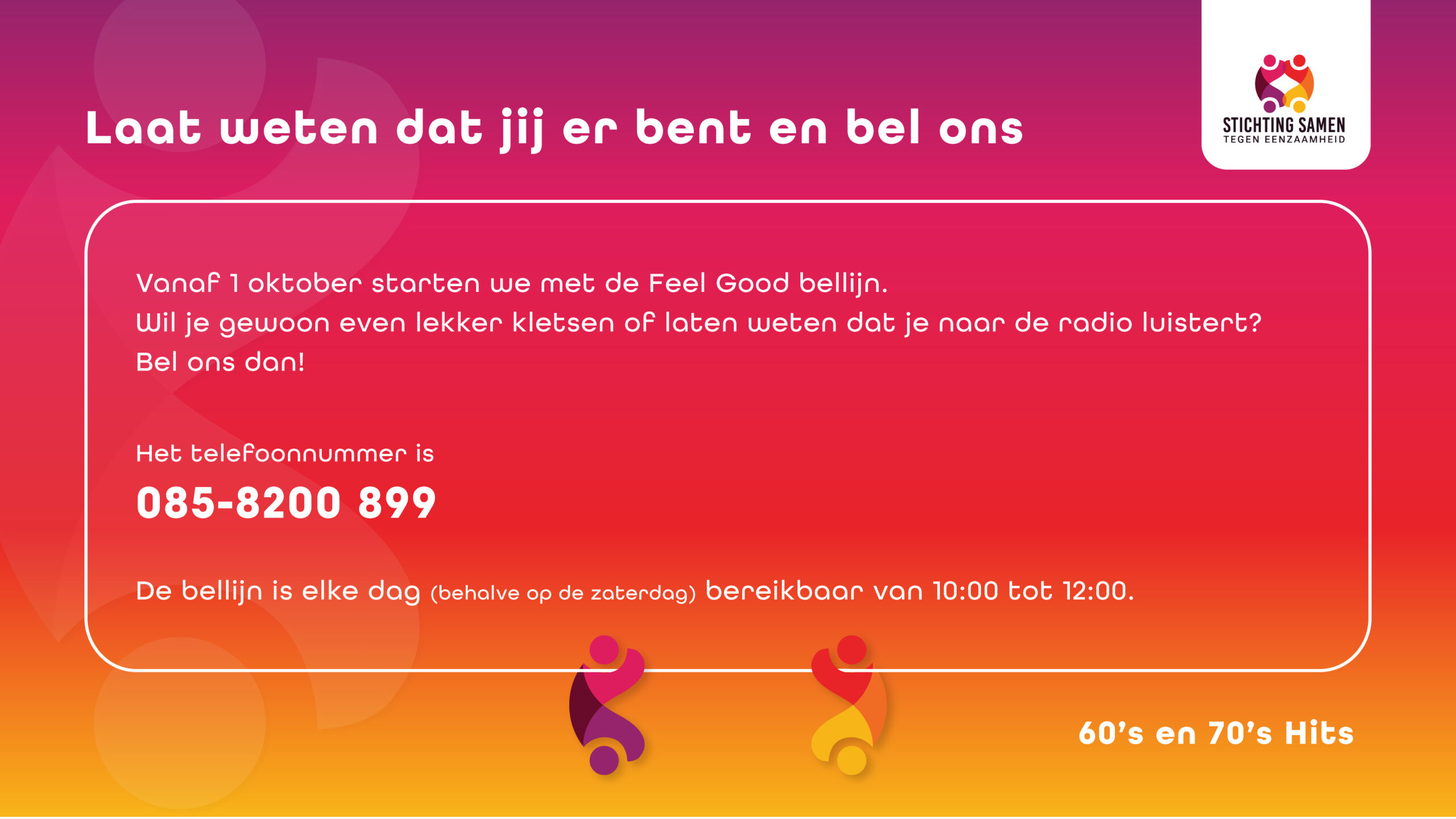 Vanaf vandaag kun je van zondag tot en met vrijdag elke ochtend van 10 tot 12 uur bellen met onze bellijn. Voor zomaar een praatje of het delen van een herinnering. Bijvoorbeeld aan een liedje dat je gehoord hebt bij 60’s & 70’s Feel Good. We hebben de tijd voor je!