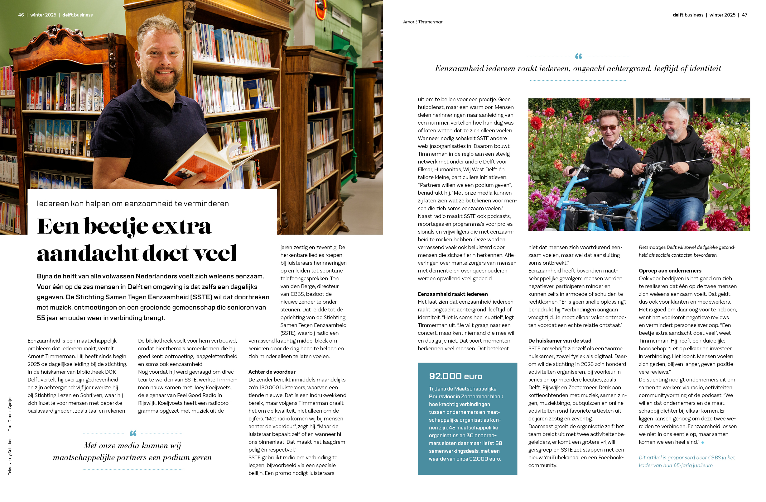 In de nieuwste editie van Delft Business vertelt Arnout Timmerman over zijn werk bij de Stichting Samen tegen eenzaamheid. Sinds begin 2025 deelt hij zijn passie voor verbinding en ondersteuning. De stichting zet radio met muziek uit de jaren zestig en zeventig in als krachtig middel om eenzame senioren te bereiken. “Met radio komen wij bij mensen achter de voordeur,” benadrukt Timmerman.